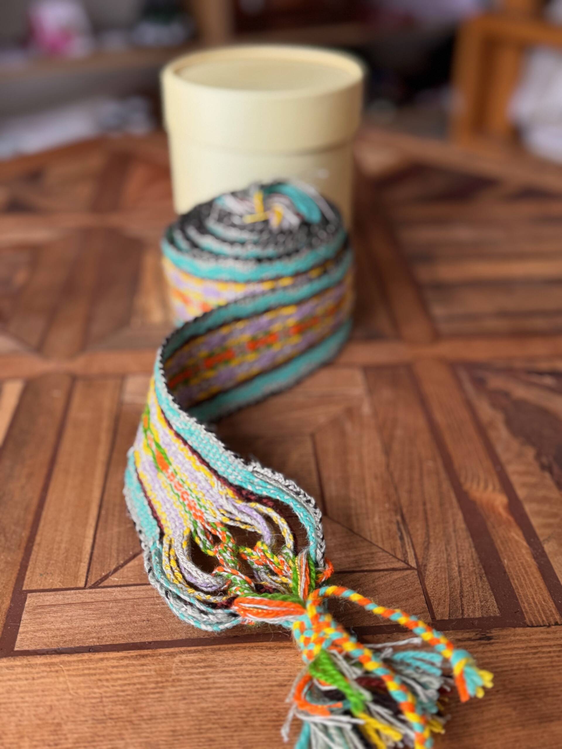 Kirivöö on kootud linase lõime ja täisvillaste lõngadega. Keskel oranzile südamelõimele ja kollasele on juurde lisatud kuldne niit. Vöö ühes otsas on narmad punutud palmikutesse ja palmikud on ühendatud punutises, teises otsas on lühikesed narmad ( 5,5cm ja 12,5cm). Vöö on valminud käsitööna.